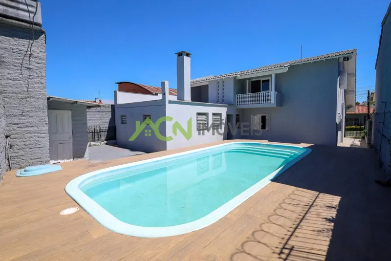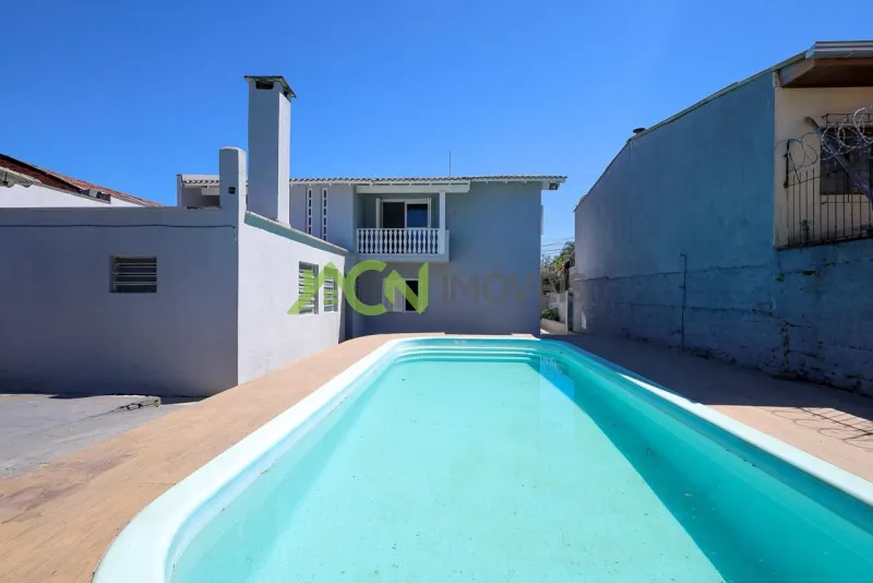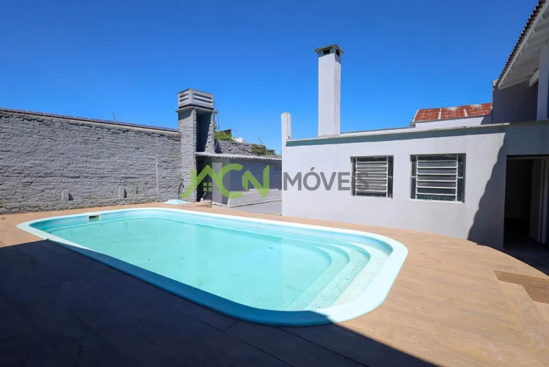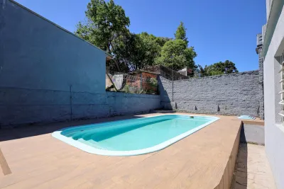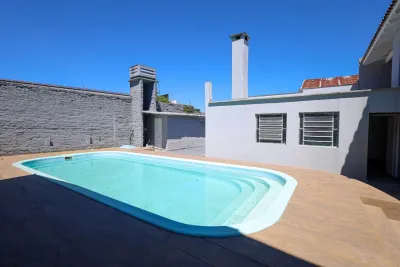 Na área externa, um pátio amplo com piscina de aproximadamente 3x9m, espaço revitalizado e pronto para lazer. Conta ainda com jardim gramado na frente, dois portões eletrônicos, garagem para 3 carros, e cômodo auxiliar nos fundos para depósito ou ateliê.