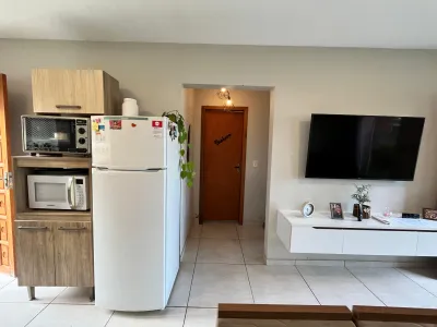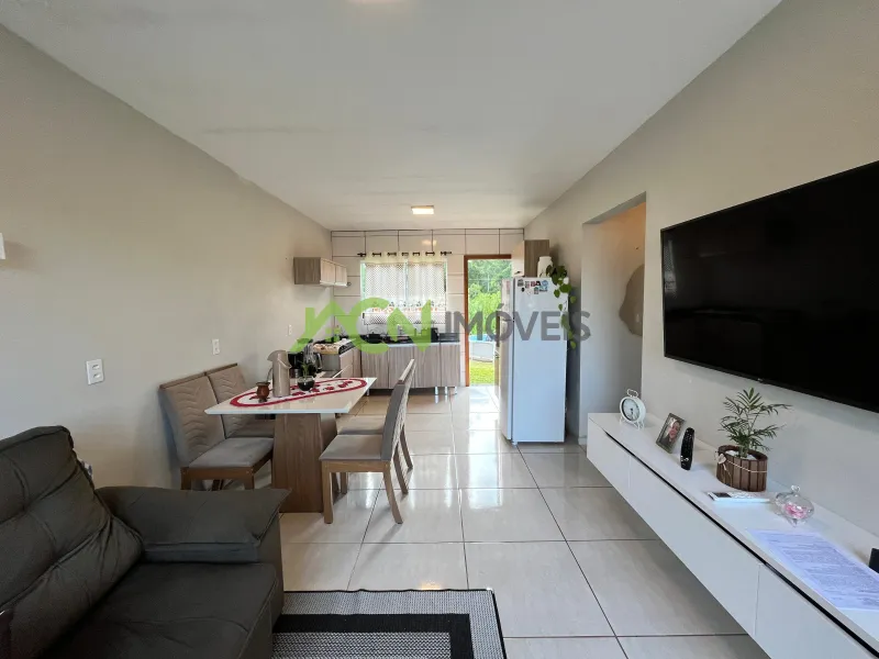 A sala de estar e jantar é integrada com a cozinha, criando um ambiente acolhedor