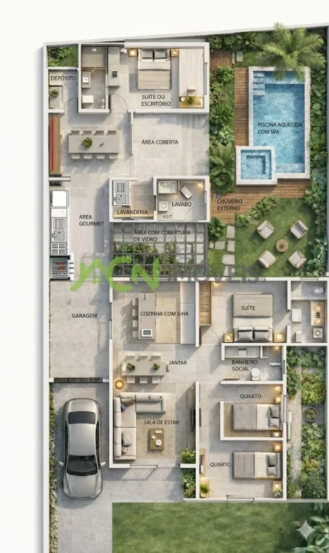 - Conta com área social em conceito aberto, integrando sala de estar, jantar e cozinha com ilha, proporcionando um ambiente moderno e acolhedor. Na parte externa, oferece espaço de lazer com piscina com SPA e aquecimento solar, além de área gourmet com churrasqueira.